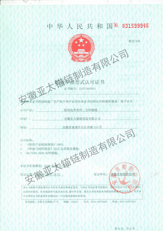 安徽亞太錨鏈制造有限公司是國家高新技術(shù)企業(yè),也是國家GB/T 549-2017《電焊錨鏈》標準的起草和制定單位之一。公司旗下設(shè)有錨鏈分廠、浮標分廠、舾裝件分廠等多個分廠。公司專業(yè)從事φ12.5mm-φ107mm二、三級船用錨鏈、浮標錨鏈、錨鏈附件,錨、船舶曬裝產(chǎn)品、航標、系船浮、船型標、多種規(guī)格海洋監(jiān)測浮標及航標燈等產(chǎn)品的生產(chǎn)、安裝和服務(wù)。目前公司的產(chǎn)品銷往全國各地船廠、碼頭、航標處、航道局、海洋局,并已走上國際市場,如東南亞、中東、歐美等國家。